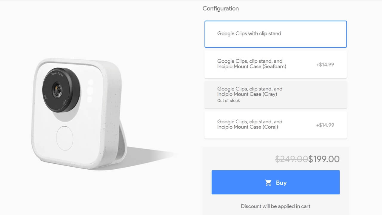 米国の Google ストアにおいて、2018 年 2 月に発売されたばかりの Google 製 AI 搭載ウェアラブルカメラ「Google Clips」が、元値 $249.00 から $50 引きの $199.00 に値下げされました。