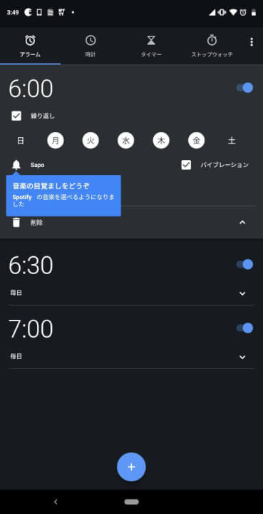 2018 年 8 月 4 日、通常 Android にプリインストールされている「時計」アプリが v5.3 にアップデートされ、音楽ストリーミングサービス「Spotify」で配信されている音楽をアラームにセットできるようになりました。