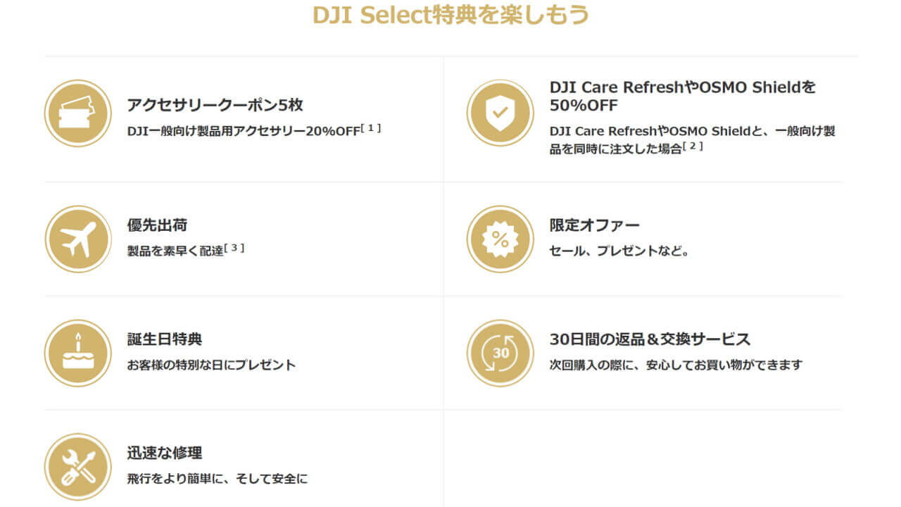 「DJI Select プログラム」は年 3,960 円の有料で、様々な特典を受けることができるメンバーシッププログラムです。