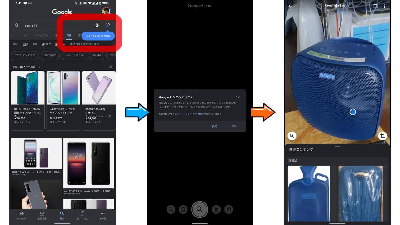 一旦「Google」アプリで何らかの検索を行ったあとでないと[画像]タブも表示されないので、この「Google レンズ」ボタンへたどり着くためには数工程必要です。つまりあまり実用的ではなさそう。しかし覚えておけば、いつか役に立つこともあるでしょう。