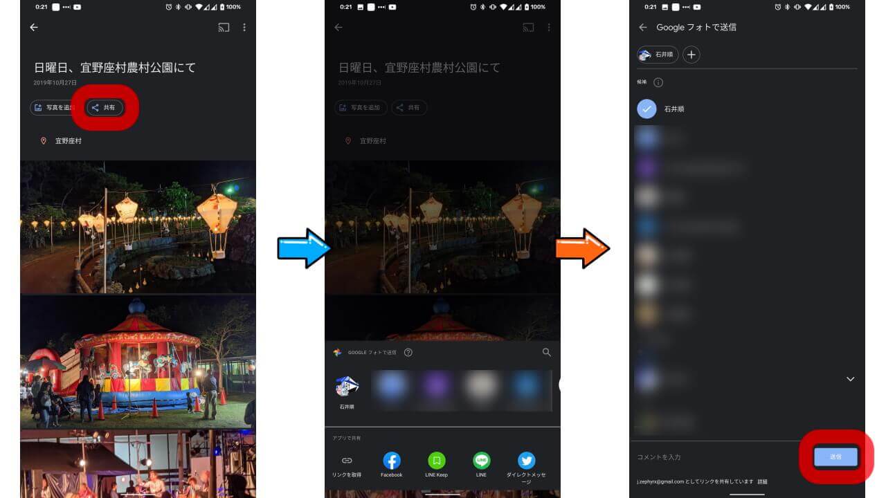 実際に共有する方法は、任意の共有アルバムを開いて共有アイコンをタッチし、[Google フォトで送信]部分に表示される Google アカウントユーザーの中から、共有するユーザーを選択します。そして[送信]をタッチしますが、コメントも同時に送信することが可能です。