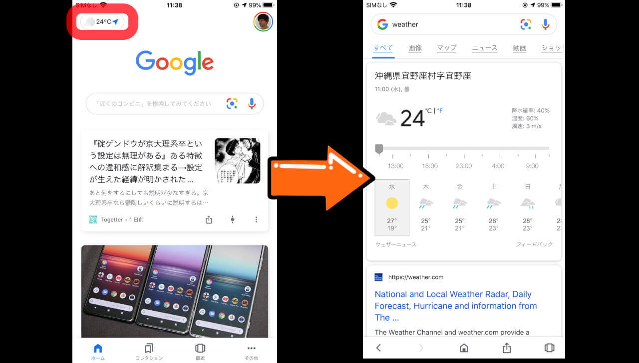 iOS 版「Google」アプリの天気情報は、トップページ左上に表示されます。また天気情報部分をタッチすると、詳細情報ページが表示されます。