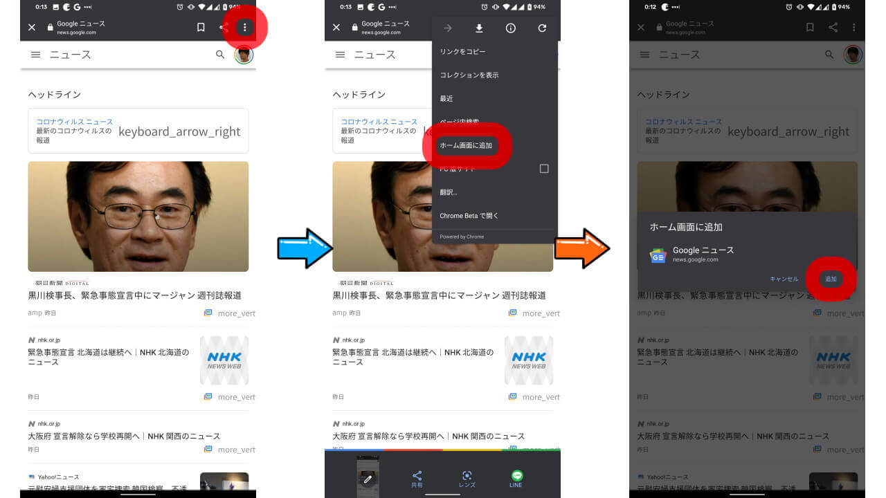 「Google ニュース」を「PWA」としてインストールする方法は簡単です。基本的にはすべての OS 共通で、「Chrome」のメニューから[ホーム画面に追加]をタッチして進めるのみ。