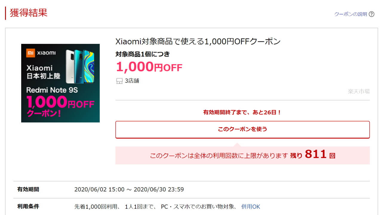 しかもこのクーポン、一人一回限りで、先着 1,000 回限定。現時点でまだ 800 回以上残っています。またクーポンの有効期限は 6 月 30 日まで。
