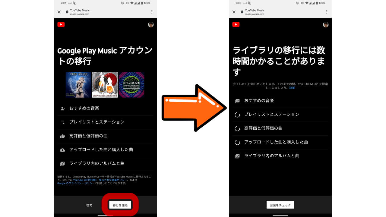 あとは、[おすすめの音楽][プレイリストとステーション][高評価と低評価の曲][アップロードした曲と購入した曲][ライブラリ内のアルバムと曲]が順次移行されます。