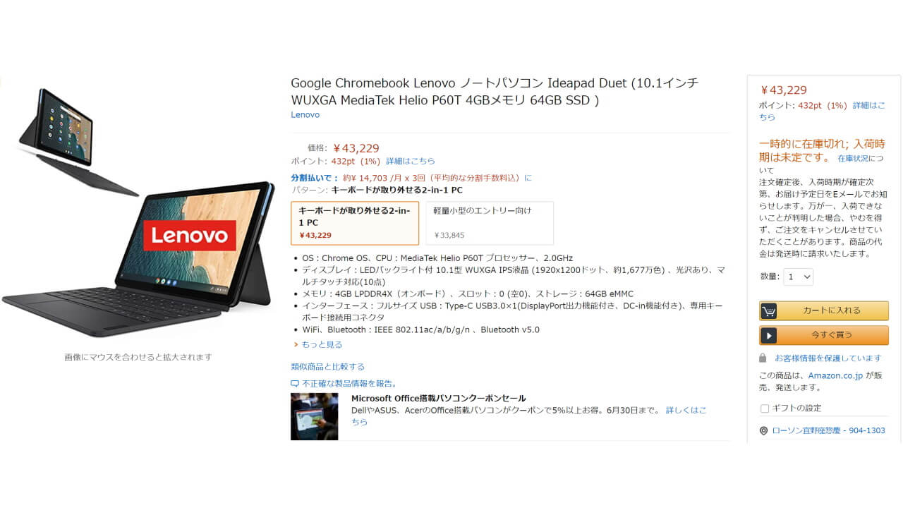 「Lenovo IdeaPad Duet Chromebook」の Amazon 価格は 43,229 円。