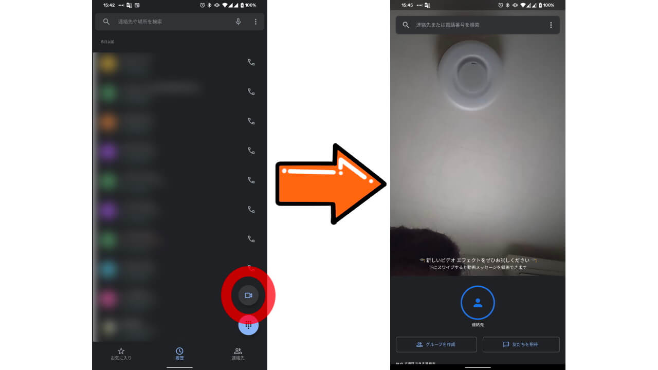 「電話」アプリに追加された「Google Duo」ボタンは、ダイヤルボタンの直上に配置されています。ここをタッチすると、「Google Duo」アプリが開きます。