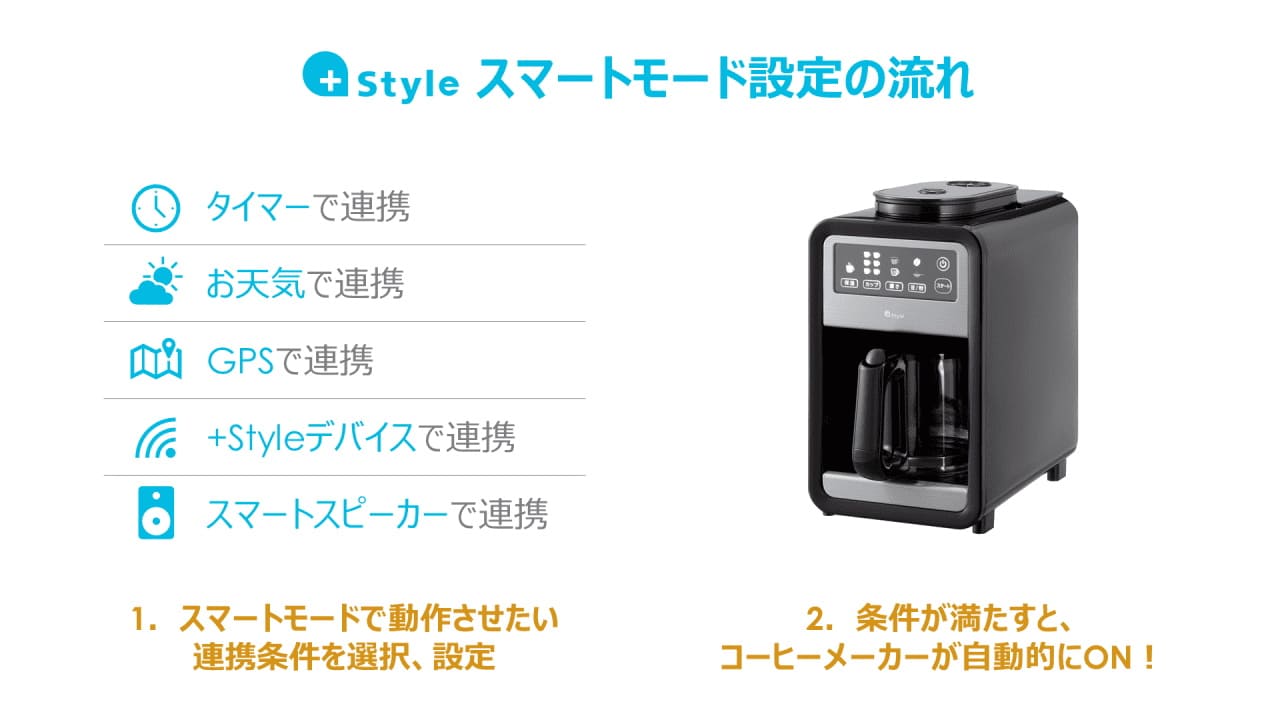 [タイマー][お天気][GPS][+Style デバイス(スマートリモコンなど)][スマートスピーカー(Google アシスタント / Amazon Alexa)]の 5 種類の連携に対応。事前設定各条件、各スマート操作に応じた全自動操作にて、淹れたてコーヒーを楽しむことができます。
