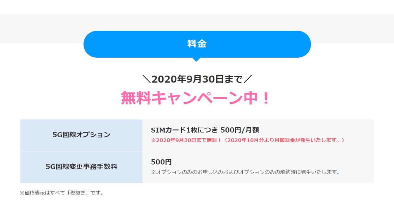 - SIM 1 枚につき月額 +500 円(税抜き)で「5G」利用可能