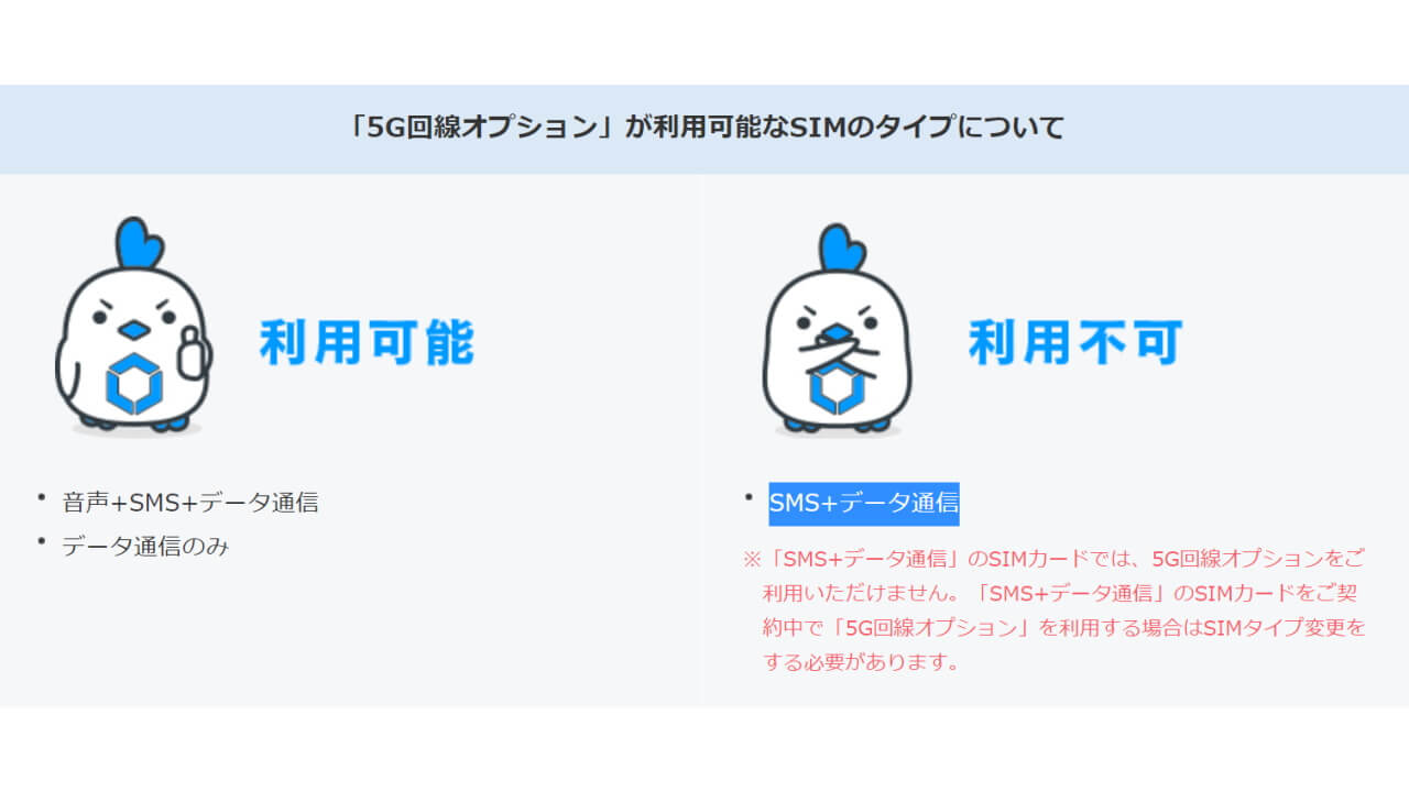 また「5G 回線オプション」は、音声通話 SIM と SMS なしデータ SIM で利用することができますが、SMS 付データ SIM では利用することができません。ご注意ください。