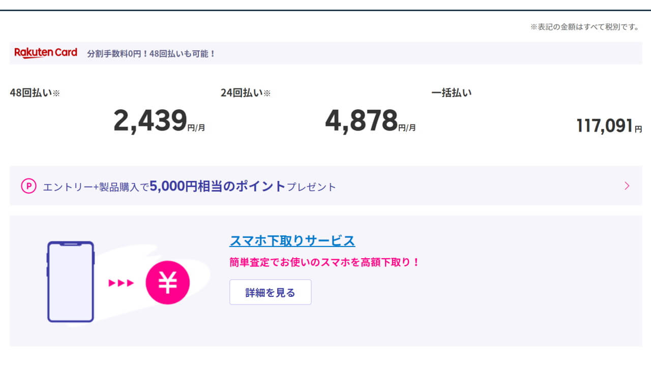 「楽天モバイル」における「AQUOS R5G」の価格は、一括 117,091 円(税抜き)、48 分割では約 2,439 円(税抜き)× 48 回、24 分割では約 4,878 円(税抜き)× 24 回です。