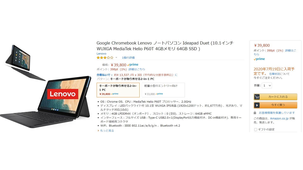 - 国内 Amazon.co.jp で「Lenovo IdeaPad Duet Chromebook」入荷予定が 1 日短縮