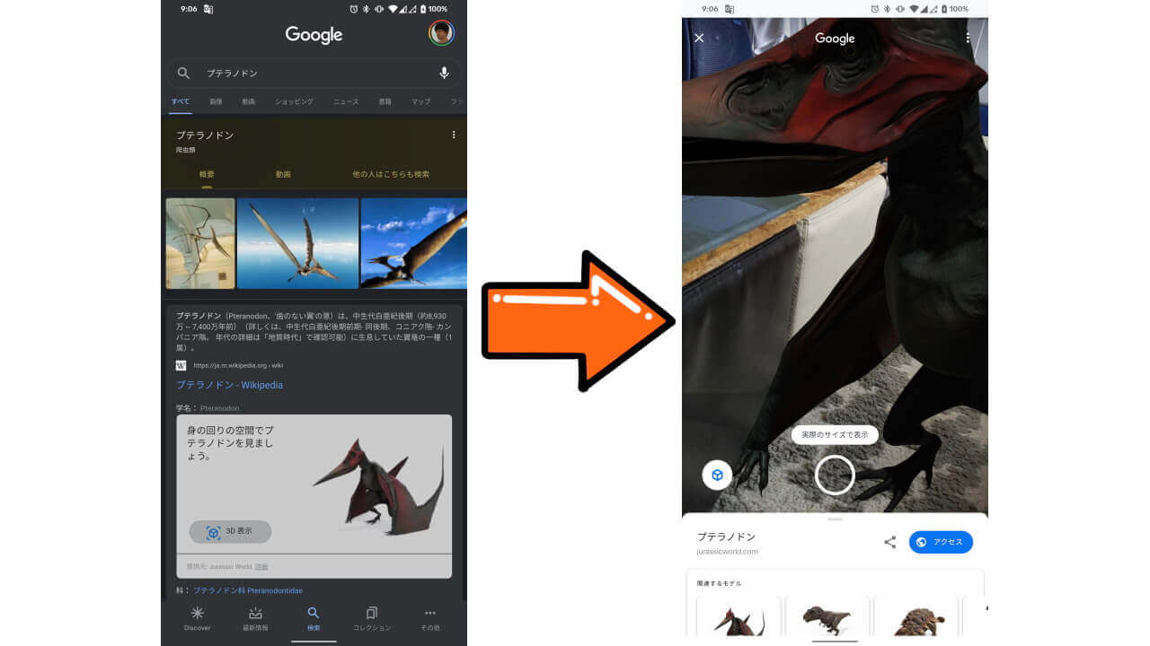 [恐竜 AR]は、「Google」アプリや「Chrome」「Safari」アプリにて、対象の恐竜名を検索して、さらに[3D 表示]や[周囲のスペースに表示する]をタッチすることで、画面上にリアルな恐竜を出現させることができる面白コンテンツです。