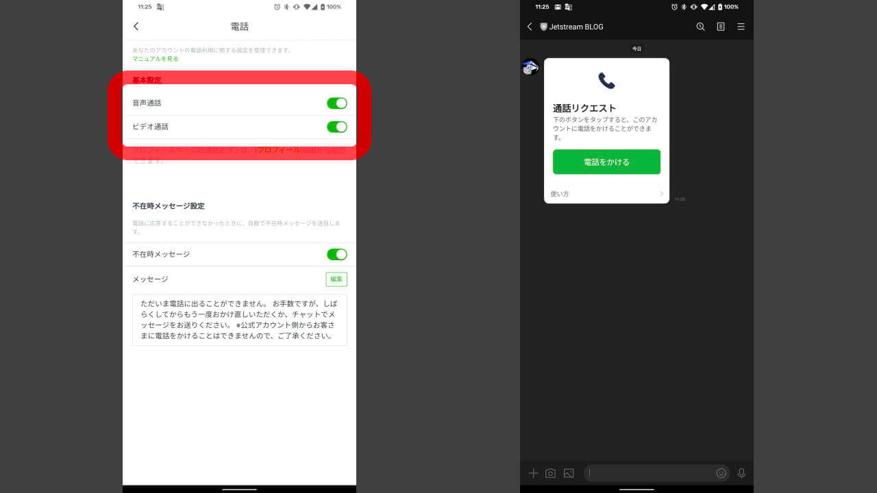 [LINEコール]はユーザーからの問い合わせに、通話で対応することができるようになる便利機能です。また[音声通話][ビデオ通話]の 2 種類に分かれていて、利用する場合は事前にそれぞれを ON に設定しておく必要があります。