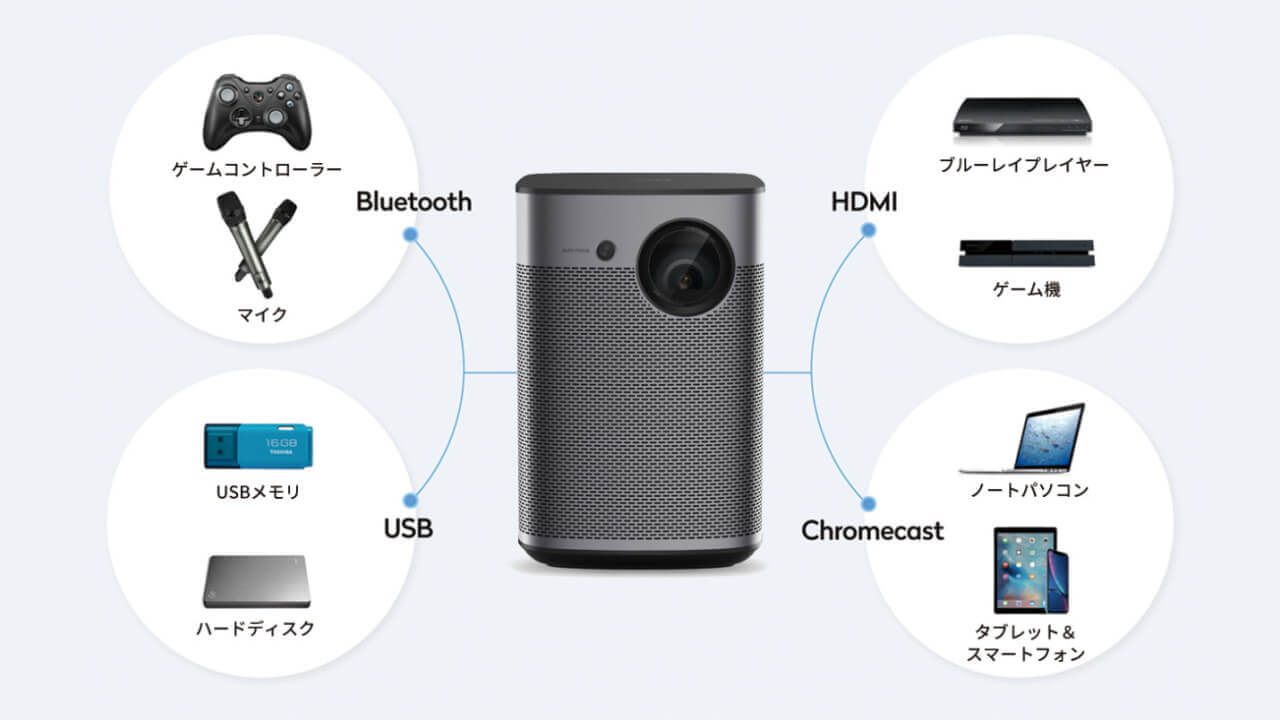 HDMI 入力端子搭載で、有線による映像 + 音声入力と投影が可能なうえに、USB Type-A(2.0)端子搭載で USB メモリやハードディスクに内蔵されているファイルを読み込んで投影することも可能となっています。