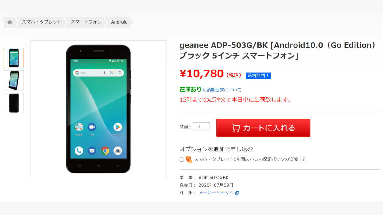 「ADP-503G」は Android 10 バージョンの「Android 10 Go Edition」を搭載。本体価格は 9,800 円(税抜き)です。