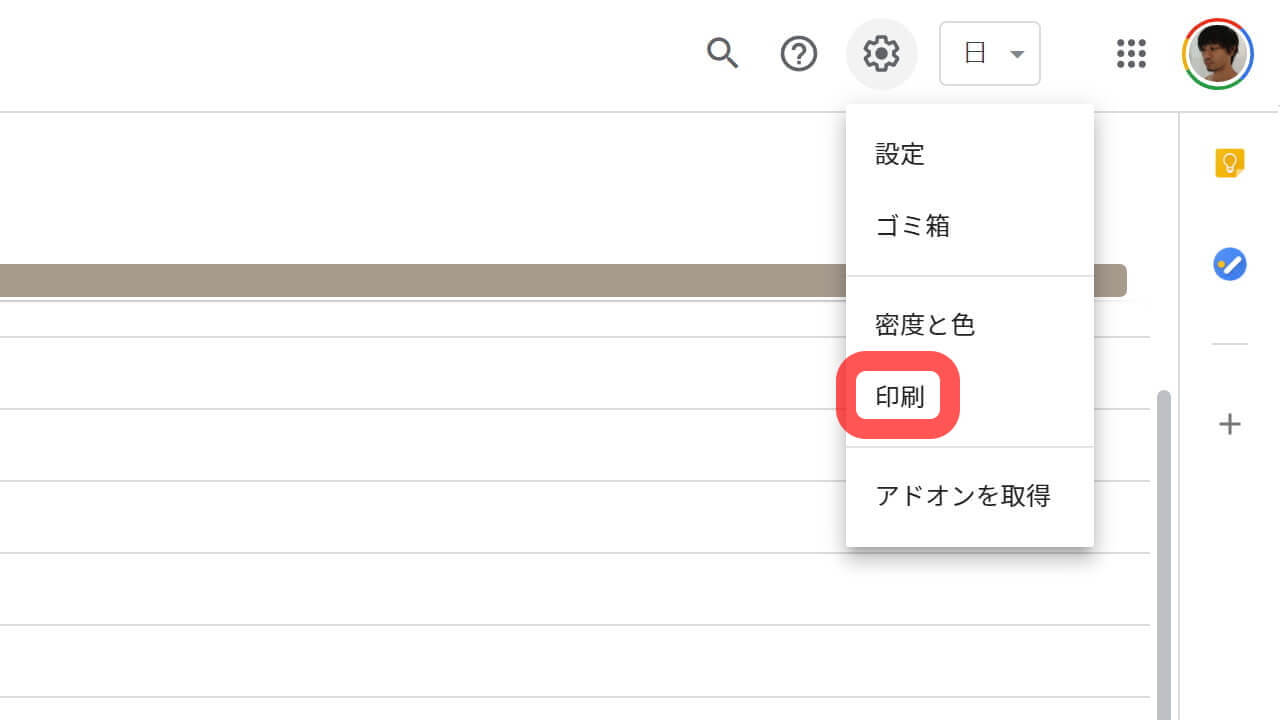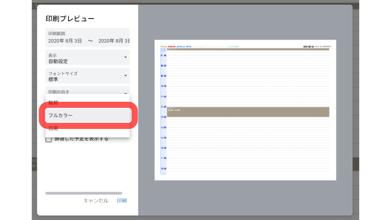 実際に[フルカラー]印刷を利用するには、「Google カレンダー」の[⚙(歯車)]アイコンから[印刷]を選択し、さらに[印刷プレビュー]の[色とスタイル]設定にて、[フルカラー]を選択し、印刷します。