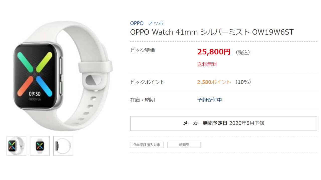 「OPPO Watch」の国内価格は税込み 25,800 円で、8 月下旬国内発売予定です。販売チャネルは、ビックカメラ、Amazon などです。特にビックカメラは 10% ポイント還元付きでお得です。