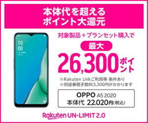 - 「Rakuten UN-LIMIT」+「AQUOS sense3 lite」or「OPPO A5 2020」契約で最大 26,300 ポイント還元!