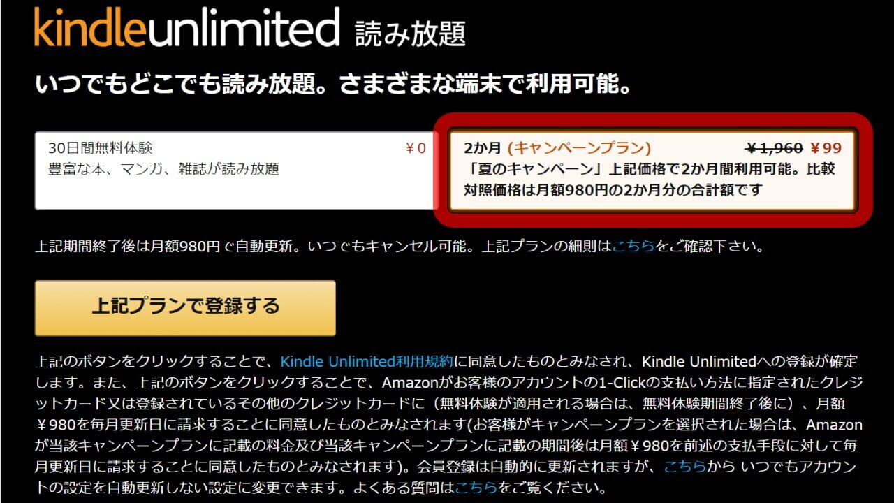 「Kindle Unlimited」は、書籍、コミック、雑誌などが読み放題となる月定額サービス。2 ヶ月間 99 円の「夏のキャンペーン」利用後は、退会しない限り毎月 980 円の自動更新が適用されます。もちろん 2 か月以内に退会した場合は、たったの 99 円しか掛かりません。