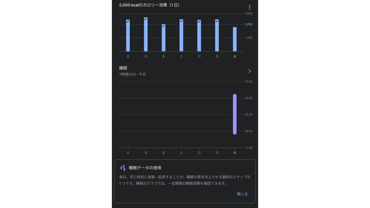 しっかりと[睡眠]のトラッキング情報も「Google Fit」に同期されていました。ただ「Google Fit」側では単に就寝時間と起床時間、そして睡眠時間が記録されているだけで、[浅い睡眠]と[安眠]は記録されていませんでした。