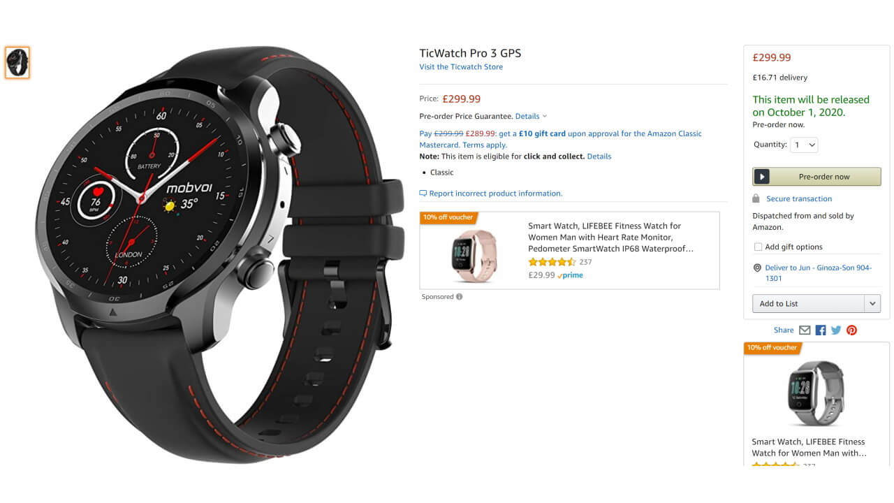 商品ページからは「TicWatch Pro 3」の主要スペックを確認することはできませんが、「Snapdragon Wear 4100」プロセッサを初搭載する機種となることは、ほぼ確定しています。ちなみに Amazon 価格は、VAT(付加価値税)込み £299.99(約 42,000 円)です。