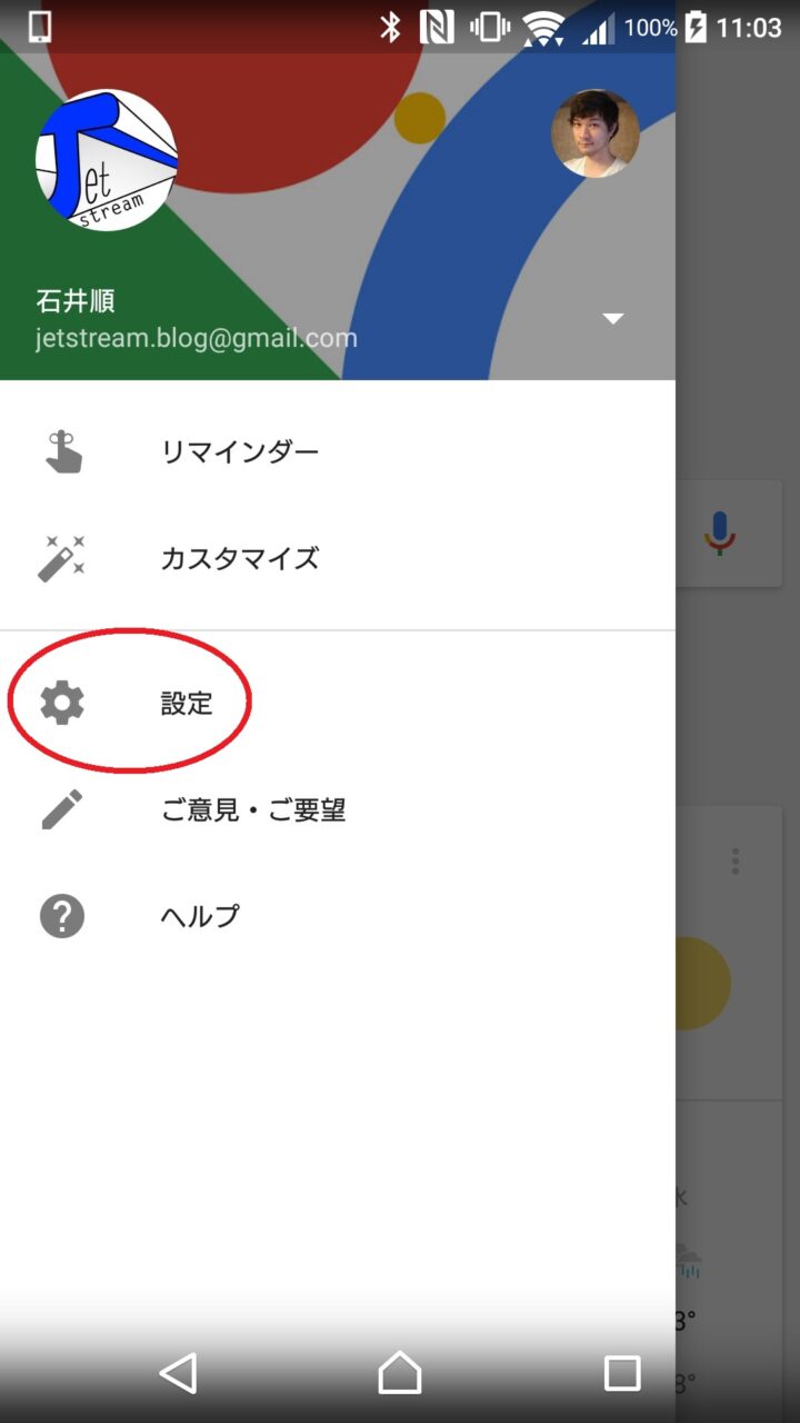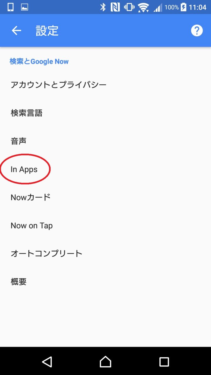 まず「Google」アプリや「Google Now」などを開き、左上のメニューから “設定” をタッチします。表示される設定項目から “In Apps” をタッチします。