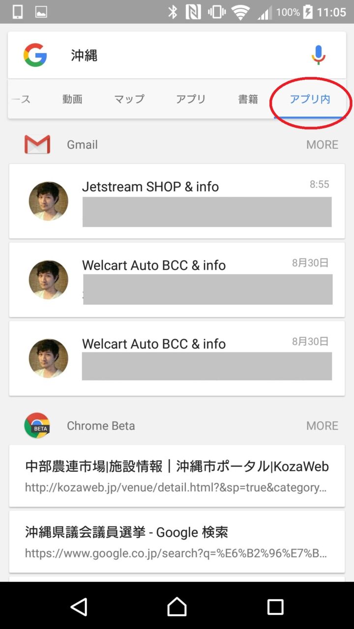 表示される検索結果は「Gmail」「Chrome」「YouTube」など Google 関連のアプリのほか、「Twitter」「Facebook」などの SNS、連絡先、SMS など、多岐にわたります。