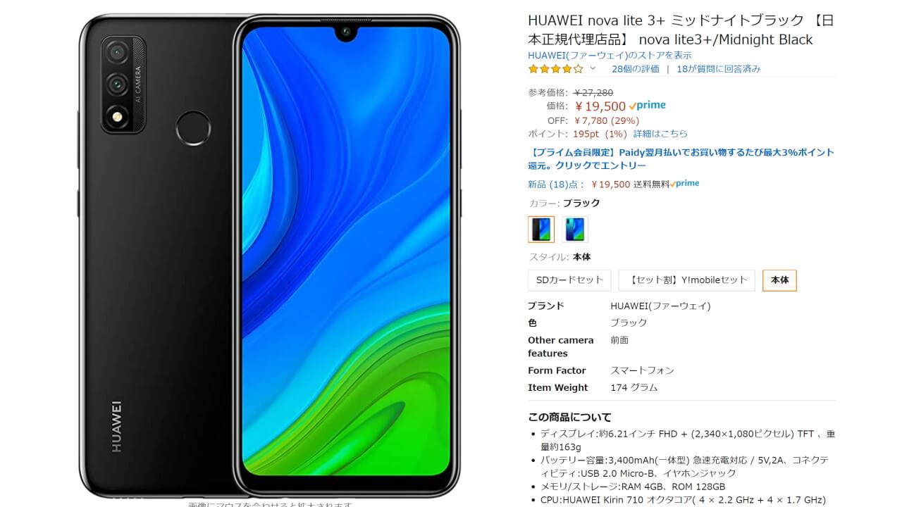 - 国内 Amazon.co.jp で SIM フリースマートフォン「Huawei nova lite 3+」が 29% 引き