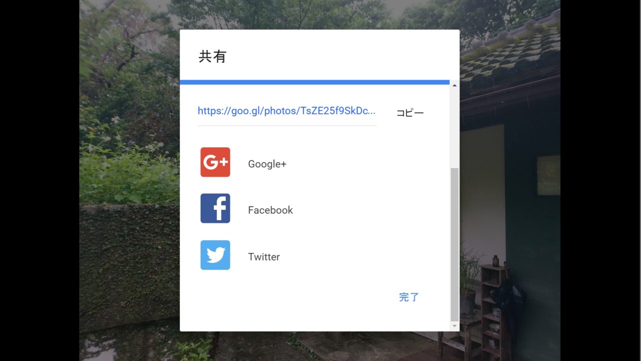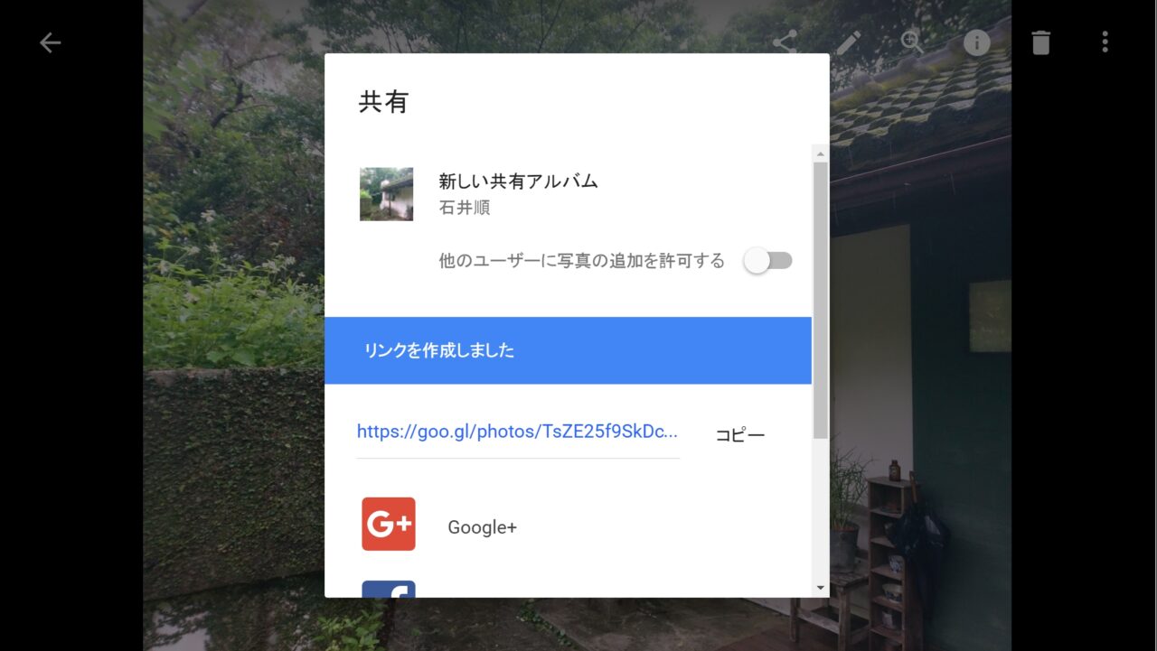 またこの共有アイコンをクリックしたときに、「Google+」「Twitter」「Facebook」には直接 “共有アルバム” として投稿できるショートカットボタンも配置されています。