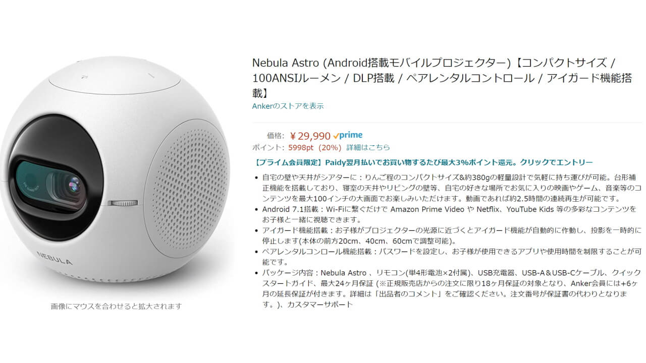 「Nebula Astro」の国内価格は 29,990 円で、国内 Amazon.co.jp にて販売されています。ちなみに今なら 20% ポイント(5,998pt)還元付きでお得です。