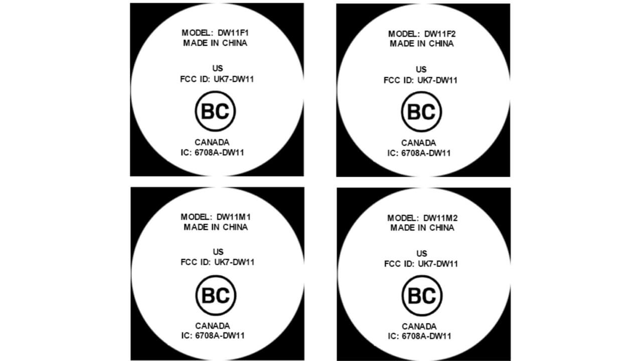 今回 FCC 認証を取得したのは、「DW11F1」「DW11F2」「DW11M1」「DW11M2」の 4 型番です。FCC ID は順に「UK7-DW11F1」「UK7-DW11F2」「UK7-DW11M1」「UK7-DW11M2」。