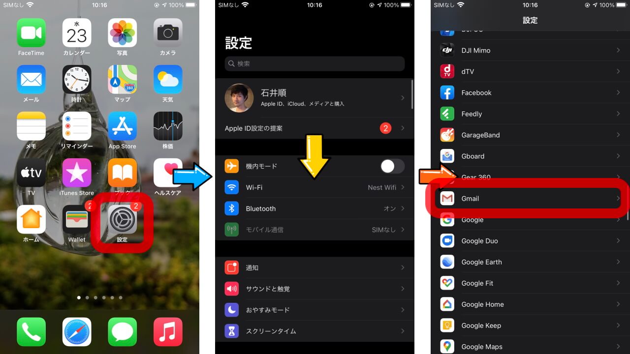 実際に iOS 版「Gmail」アプリを iOS のデフォルトメールアプリに設定する方法は、iOS の[⚙(設定)]を開いて下にスクロールし、表示される「Gmail」をタッチし、[デフォルトのメール App]をタッチして、[Gmail]を選択します。