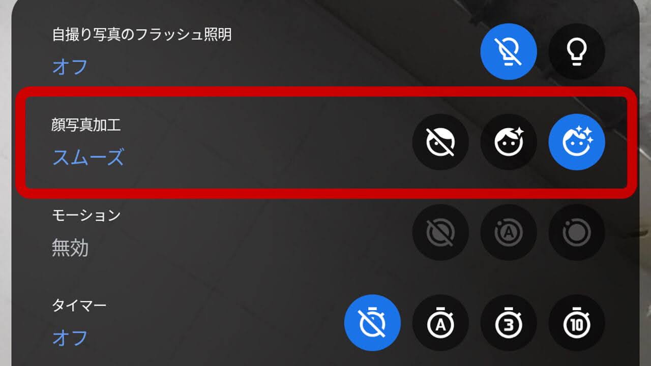「Google カメラ」の[顔写真加工]は、フロントカメラを利用する自撮り撮影時適用される美顔フィルタで、設定で[オフ][ナチュラル][スムーズ]から選択することができます。