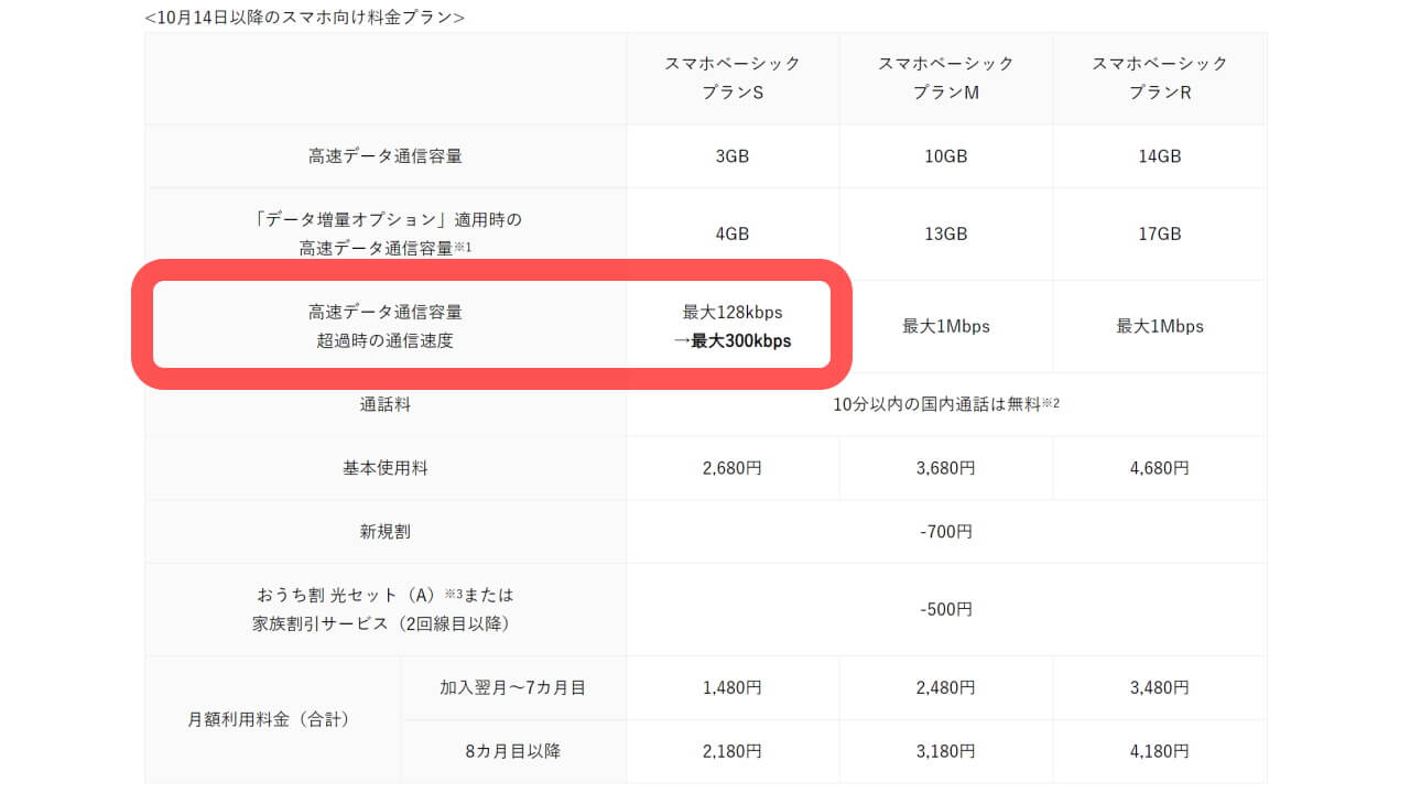 「スマホベーシックプラン S」は 2020 年 10 月 14 日の新規契約分より、月額料金(税抜 2,680 円)はそのまま変更なく、月の通信容量(通常 3GB)を超過した場合の通信速度を、これまでの最大 128kbps から 300kbps に高速化されます。このほかは特に変更ありません。