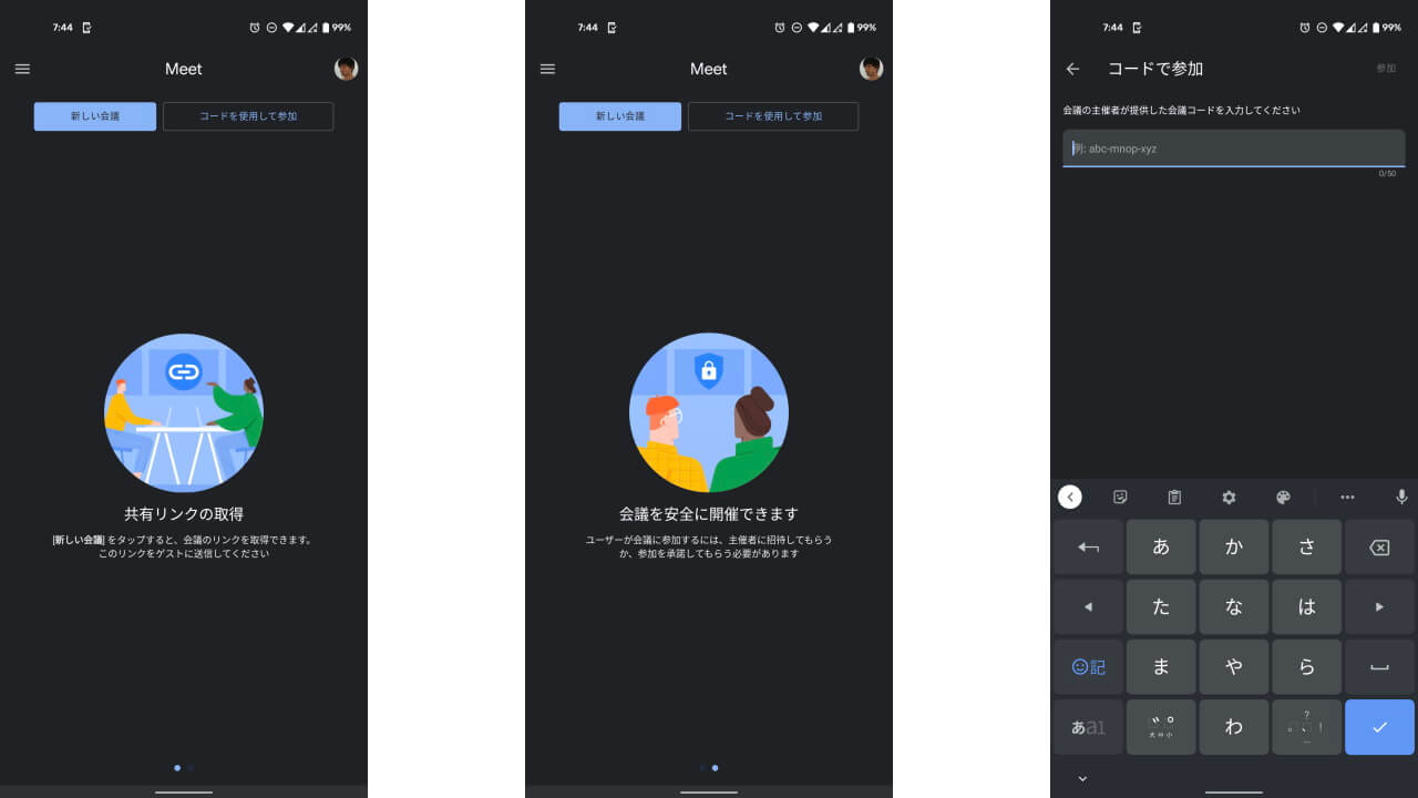 新しい「Google Meet」アプリの UI は、2020 年 7 月ごろより展開が開始された、「Gmail」アプリにおける[Meet(会議)]タブ内の「Google Meet」と同じ仕様です。つまり「Google Meet」アプリの UI が「Gmail」アプリ[Meet(会議)]タブの UI に統一されます。