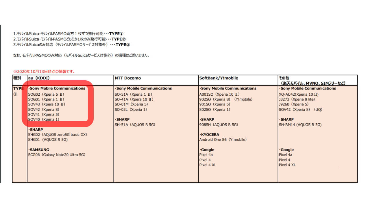 「モバイル PASMO」「モバイル Suica」両アプリ対応機種に「Xperia 5 II SOG02」が新追加