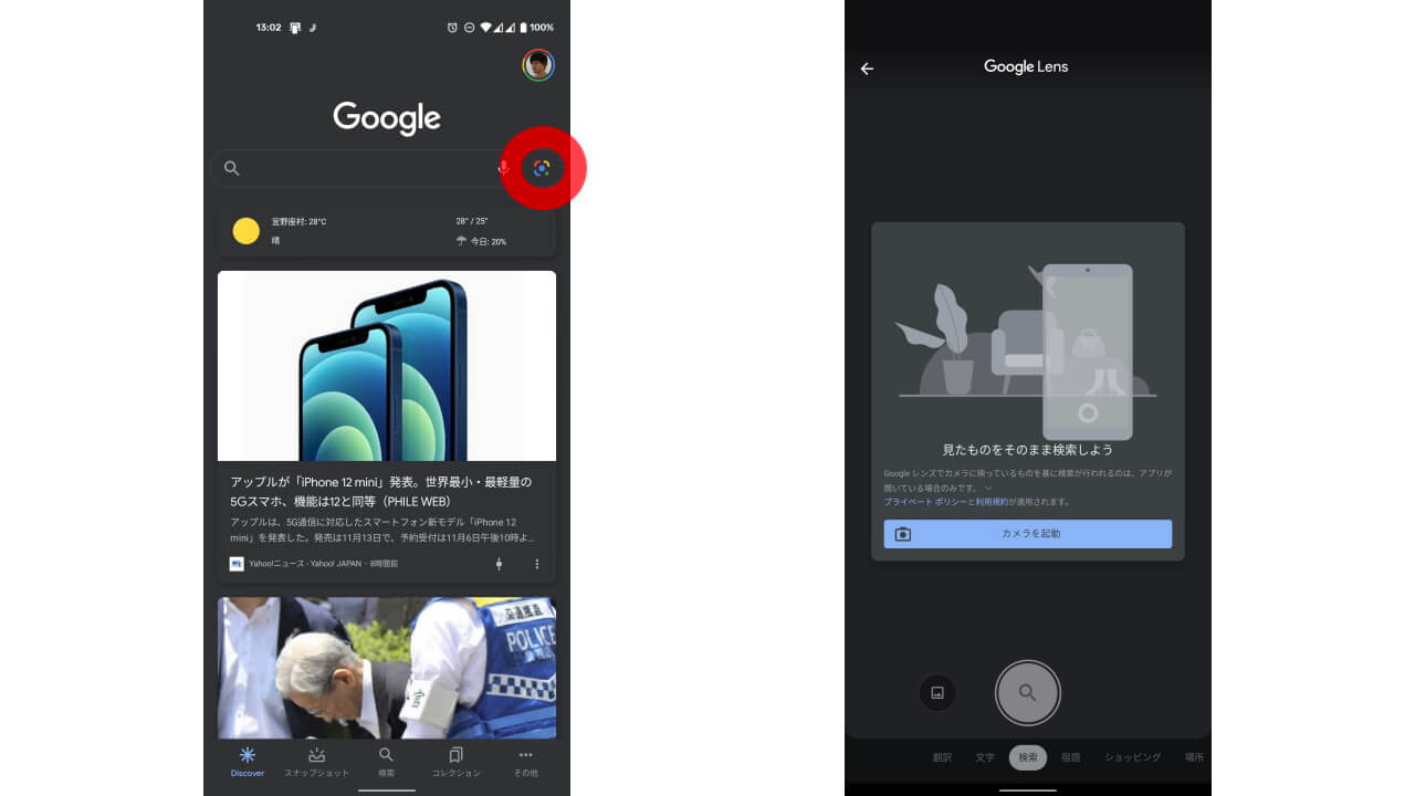 - 「Google Discover」アプリからダイレクトに「Google レンズ」を起動