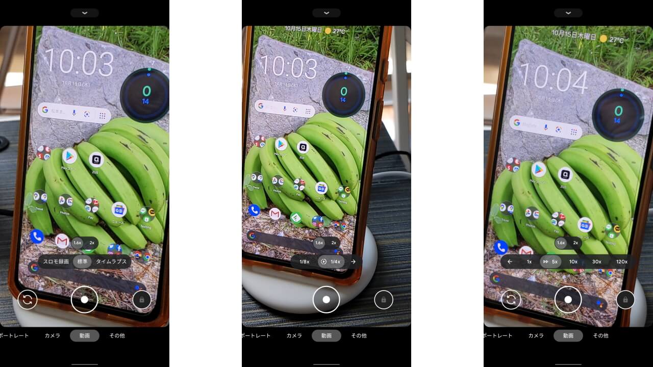 これまでの「Google カメラ」アプリでは、動画撮影モードが[動画][スロモ動画(スローモーション)][タイムラプス]とそれぞれ分かれていたのですが、新たなアプリバージョン v8.0 では、[動画]タブ内に[スロモ動画]と[タイムラプス]が内包され、撮影モードを[動画]タブ内で切り替える仕様に変更されました。