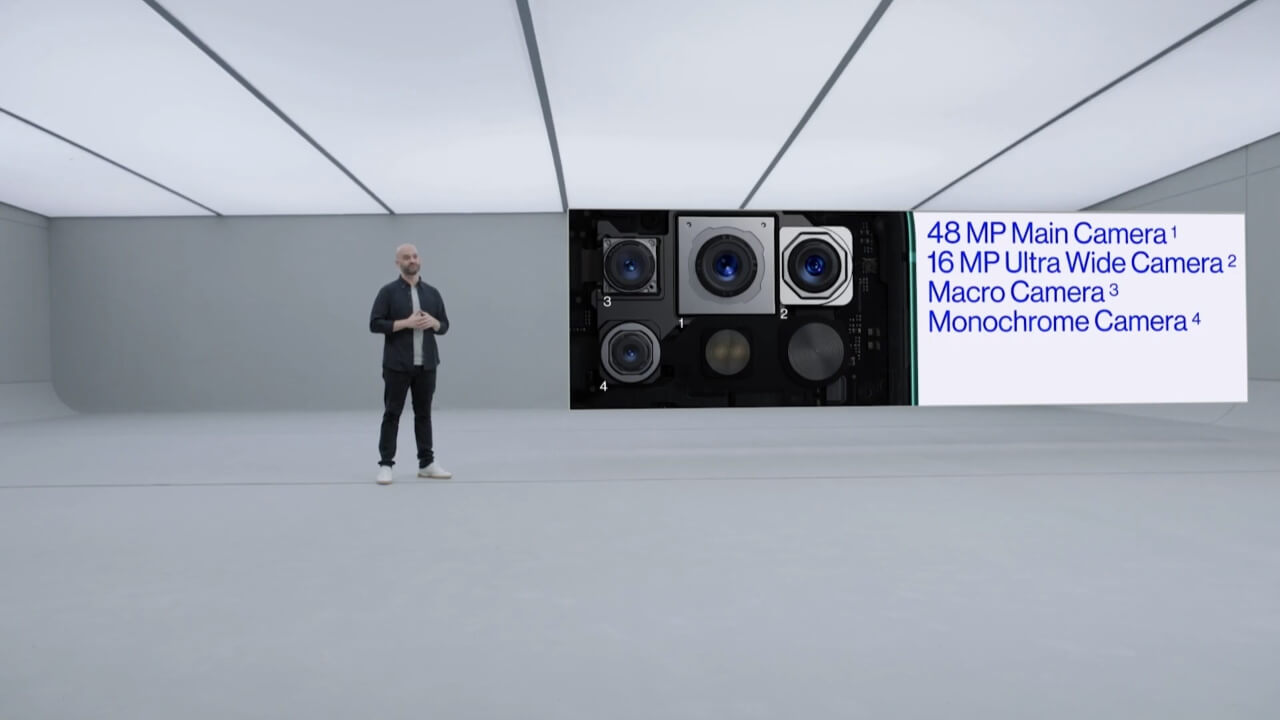 リアカメラは、4,800 万画素(F/1.75、0.8µm)メイン Sony IMX586 センサーカメラ + 1,600 万画素(F/2.2)123° ウルトラワイドレンズカメラ + 500 万画素マクロレンズカメラ + 200 万画素モノクロカメラのクアッドカメラ仕様に進化。
