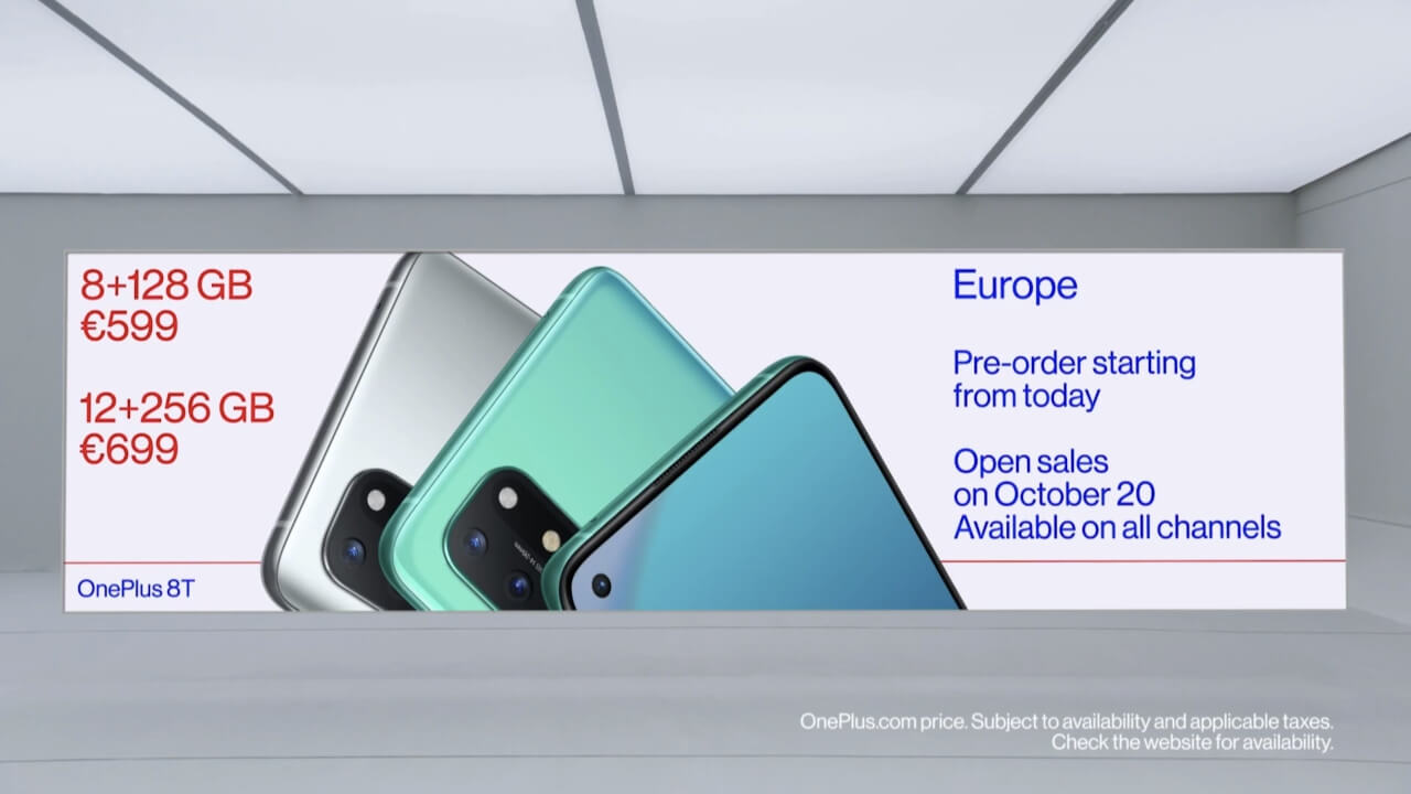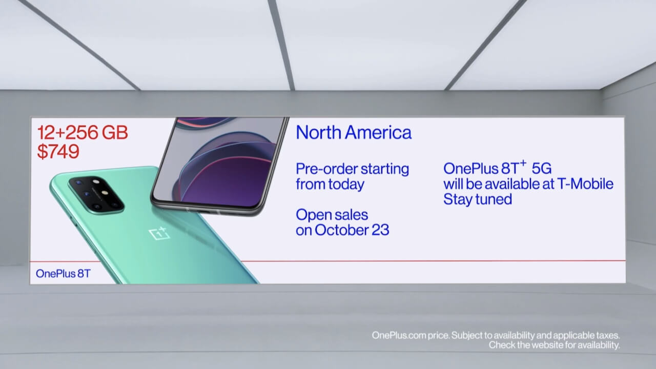 「OnePlus 8T」は発表同日より米国や欧州で予約が開始されていて、米国では 10 月 23 日、欧州では 10 月 20 日に発売されます。価格は、£540.00(8GB RAM + 128GB 内部ストレージ)or £649.00(12GB RAM + 256GB 内部ストレージ)。