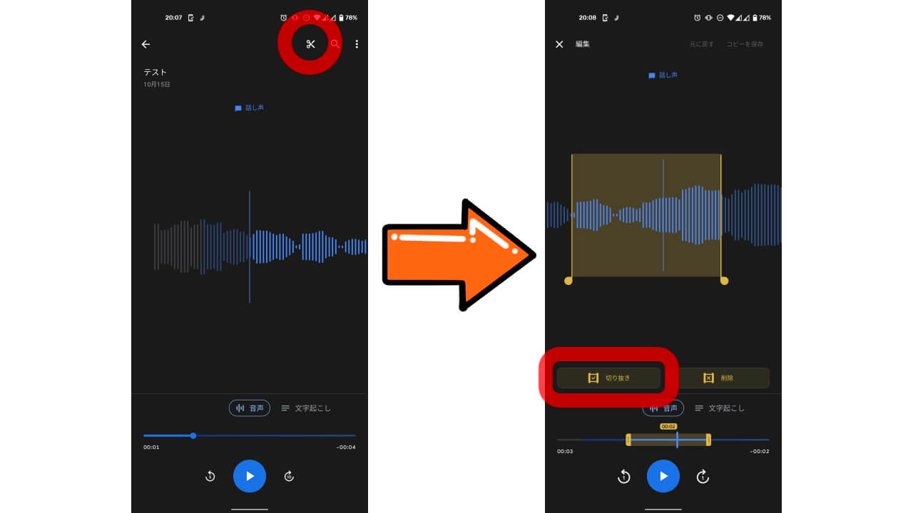 「レコーダー」アプリの[切り抜き]は簡単で、録音した音声の再生画面上部に表示される[✂(切り抜き)]アイコンをタッチして、トリミング開始地点と終了地点を選択し、画面下部の[切り抜き]をタッチするだけです。