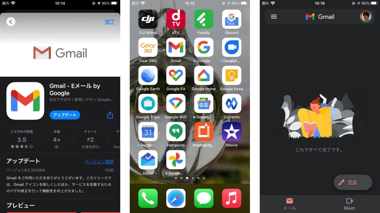 そしてつい先日、Android 版とデスクトップ版の「Google ドライブ」のロゴの刷新が提が行われたことをご報告させていただきましたが、2020 年 10 月 20 日に iOS 版「Gmail」アプリに v6.0.201004 アップデートが配信され、iOS 版「Gmail」アプリのロゴが刷新されました。