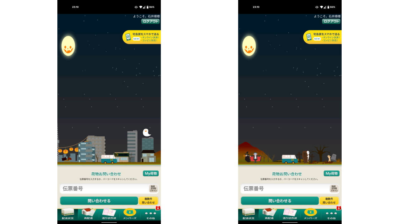 「クロネコヤマト公式アプリ」が「ハロウィン」仕様になったとはいえ、単に背景がちょこっと変わったのみ。機能面での変更などは特にありません。