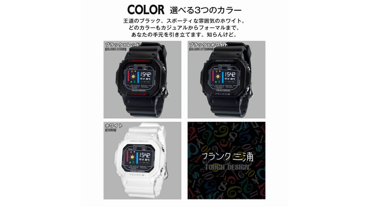 「フランク三浦 スマートウォッチ スクエアケース」は税込み 9,900 円で、11 月上旬に発売予定です。カラーバリエーションは “ブラック × ホワイト” “ブラック × レッド” “ホワイト” の 3 色展開です。
