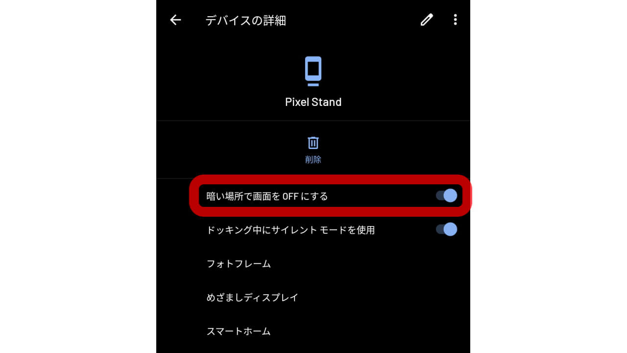 「Pixel Stand」設定にて[暗い場所で画面を OFF にする]を ON にしている場合、通常は周囲の暗さに合わせて「Pixel 5」の画面もスリープ状態になるのですが、周囲が暗いにも関わらず「Pixel 5」の画面が ON になってしまうため、明るくて就寝できない、もしくは明るいために起きてしまうという不具合が発生してしまうわけです。