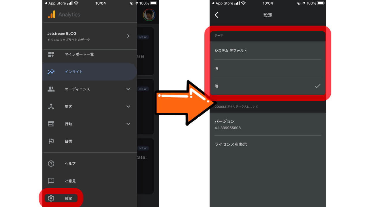 iOS 版「Google アナリティクス」アプリのダークモードは、[設定]内の[テーマ]設定として格納されています。また[テーマ]設定は、[システム デフォルト][明][暗]の 3 つから選択可能です。