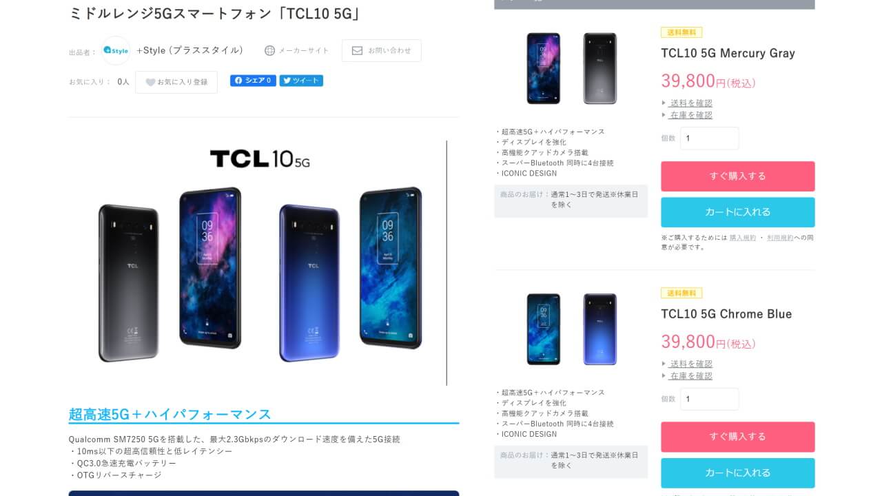 「TCL 10 5G」は送料 + 税込み 39,800 円で、“Mercury Gray” と “Chrome Blue” の 2 色展開です。