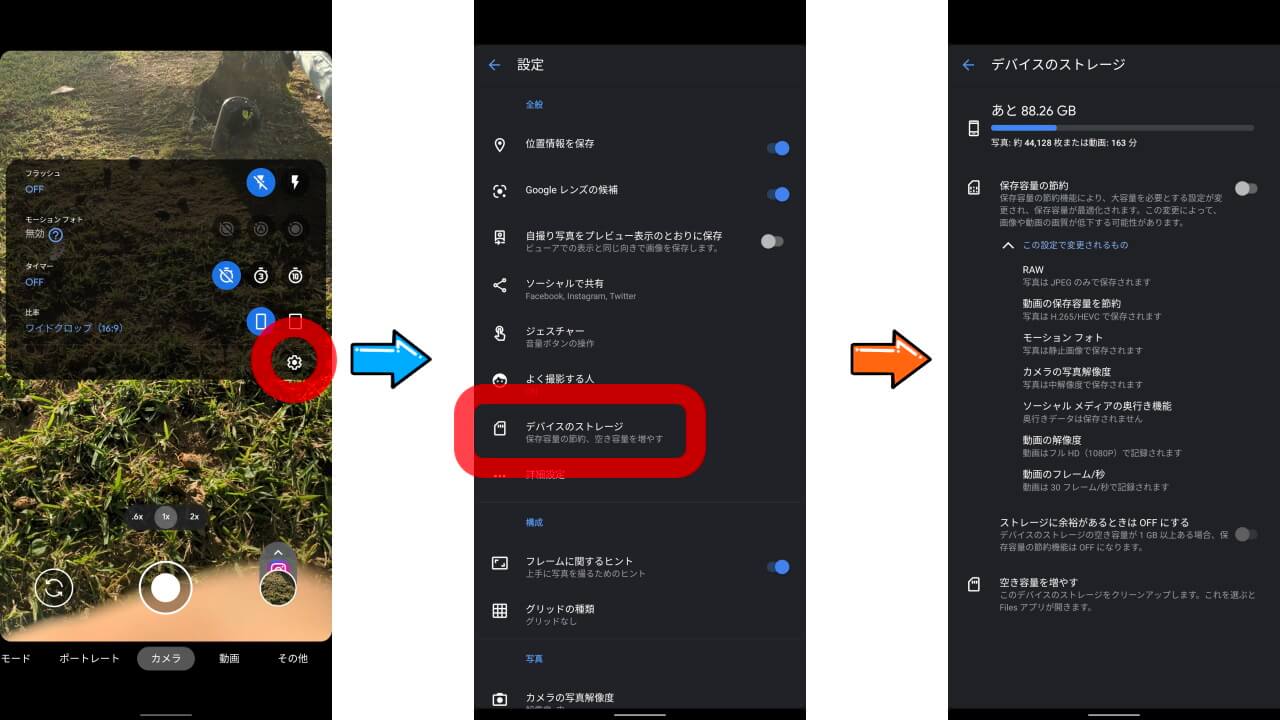 そして今回の「Google カメラ」アプリ v8.1 アップデートでは、設定メニューに[デバイスのストレージ]メニューが追加され、撮影する写真や動画の容量を最適化する[保存容量の節約]設定が新たに追加されました。