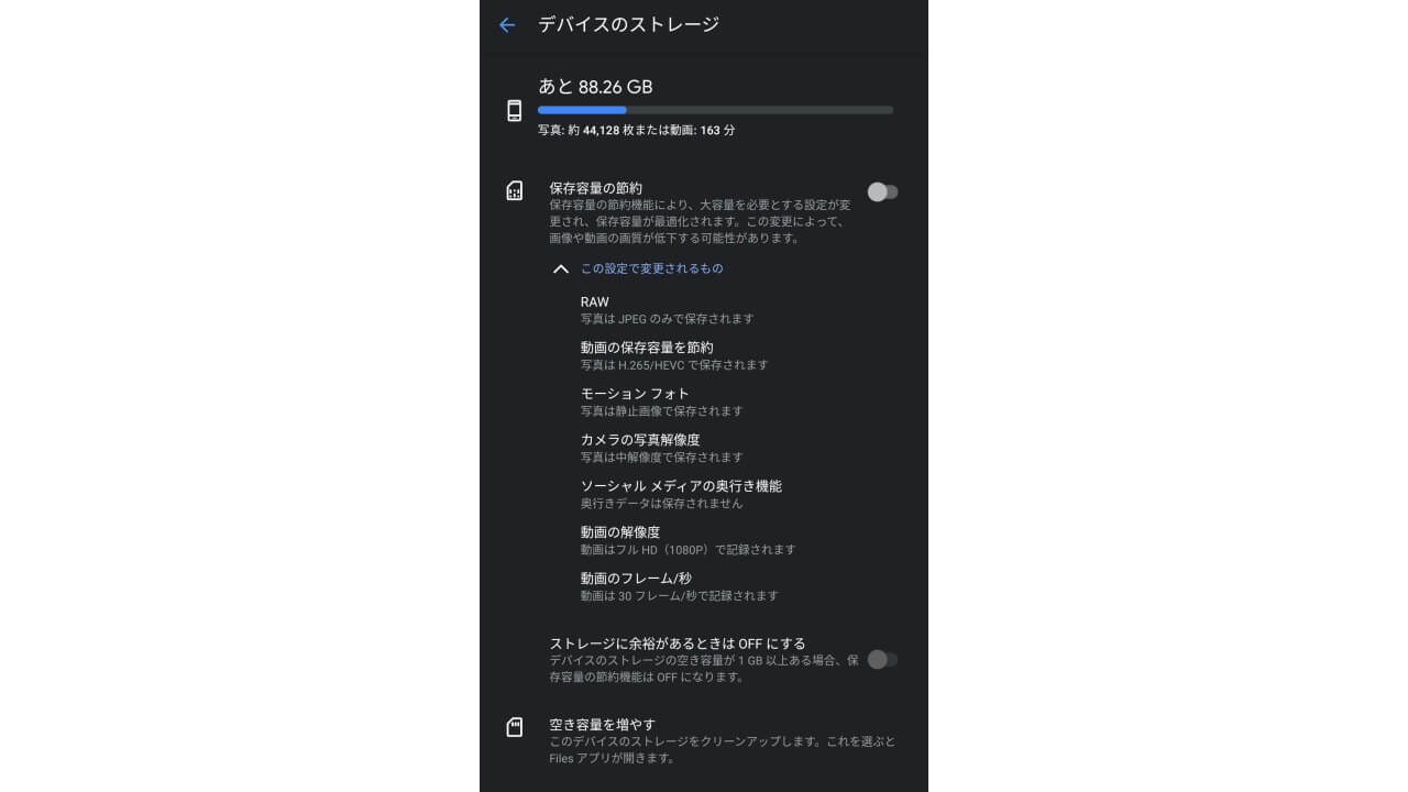実際の[保存容量の節約]設定は、「Google カメラ」アプリの[⚙(設定)]から[デバイスのストレージ]をタッチすることでアクセスできます。また[デバイスのストレージ]ページでは、現在のストレージ使用量を確認できるほか、[空き容量を増やす]をタッチすることで「Files by Google」アプリが起動し、そこからストレージクリーンアップを行うことが可能です。